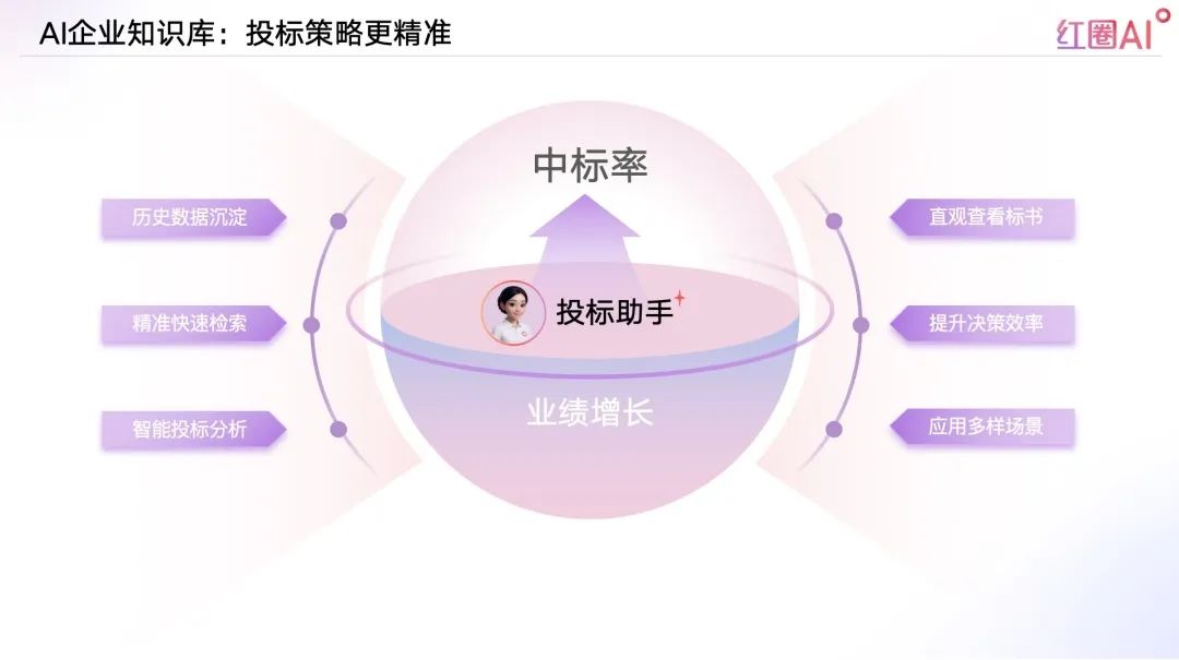 以往投標流程中,資料查找和內(nèi)容比對耗時耗力、風險頻發(fā)。紅圈AI通過快速檢索歷史標書、技術(shù)方案、成功案例等內(nèi)容,助力企業(yè)建立專屬“投標智庫”,讓策略制定更具數(shù)據(jù)支撐。