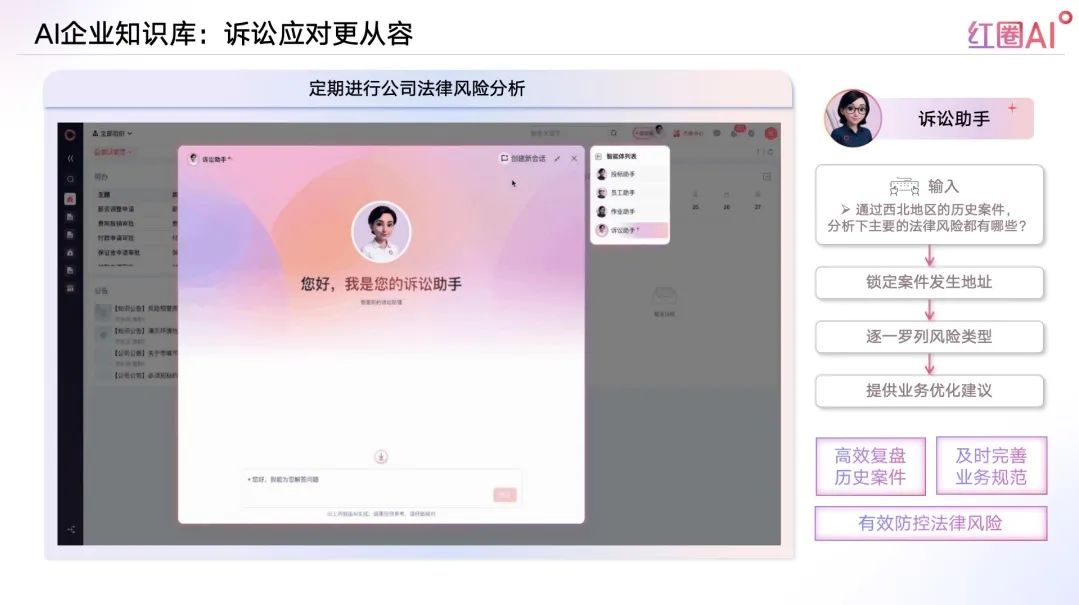 AI定期進行公司法律風險分析,訴訟助手高效復盤歷史案件,及時完善業(yè)務(wù)規(guī)范,有效防控法律風險。