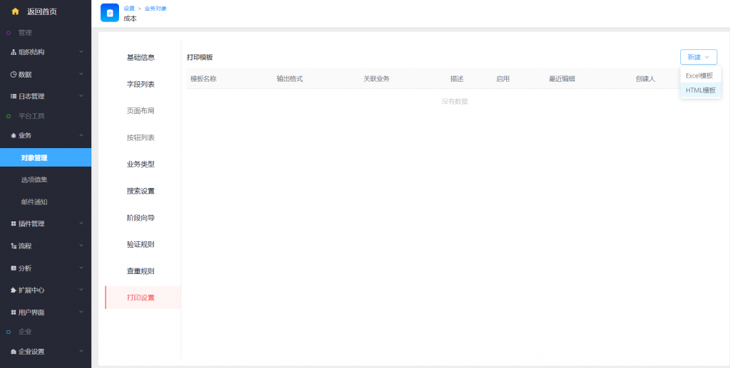 • 配置和普通excel模板打印設置在一起,路徑為:系統設置——業務——對象管理——打印設置。