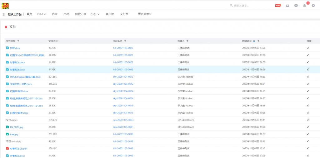 • 進入文件后,有管理權限的用戶可以看見全部文件,支持表頭篩選、下載及刪除