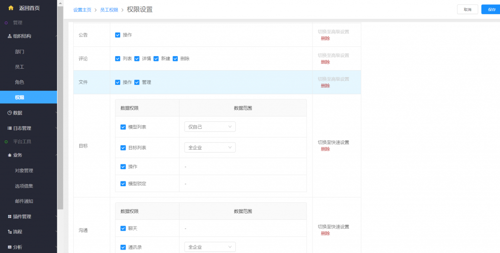 • 升級后,權限組設置中的應用操作,文件應用設置中增加了“管理”選項。