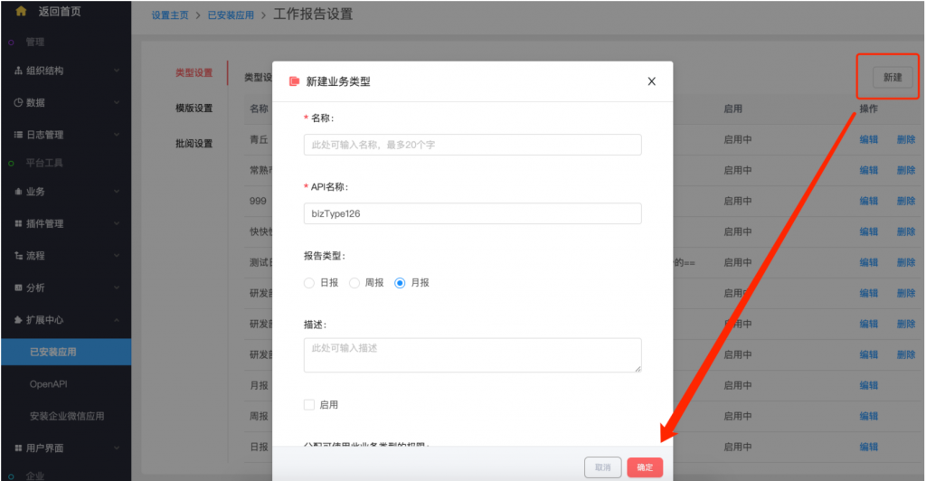 • 后臺設置:系統設置——擴展中心——已安裝應用——工作報告,類型設置支持新建類型;在模板設置中,可以按業務類型設置不同的字段和統計值;統計值設置,支持自定義名稱;
