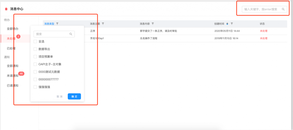 • 消息通知的類型和主題進行了規范,便于進行分類和篩選;每條消息可明確看到業務來源,主題更加清晰,大幅度減少了以“通知”為標題的消息;同時查看或處理變為整行可點擊;消息支持篩選和搜索,也可以直接搜索內容或主題;待辦和通知的狀態變化更加智能,去除了手動按鈕操作,當處理或查看詳情后,狀態會自動變化;同時優化了紅點顯示數量的刷新機制,更新更及時.