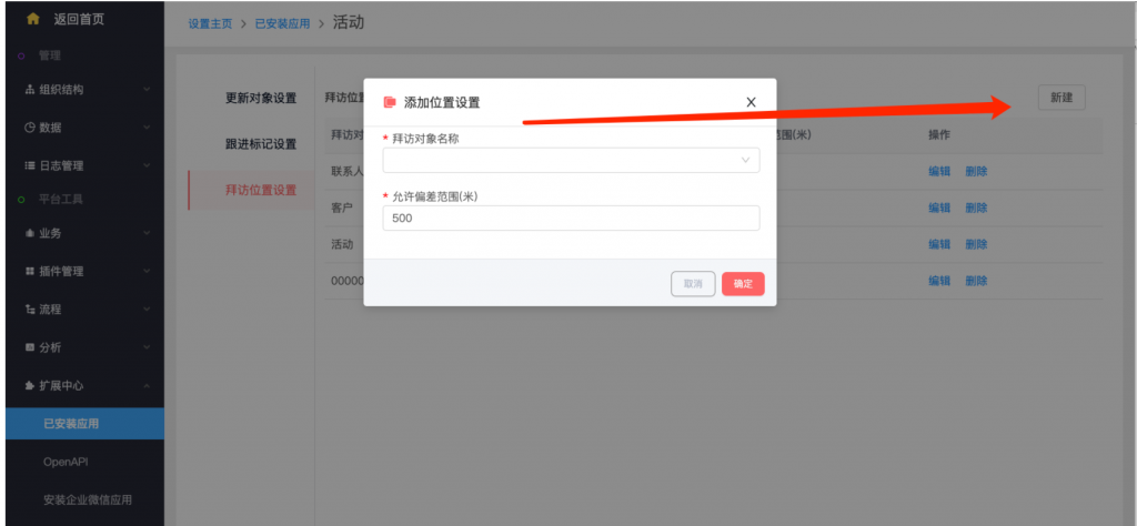 • 系統設置——擴展中心——已安裝應用——活動,增加了“拜訪位置設置”。新建拜訪位置設置,選擇拜訪對象、設置參考字段并設置允許偏差范圍