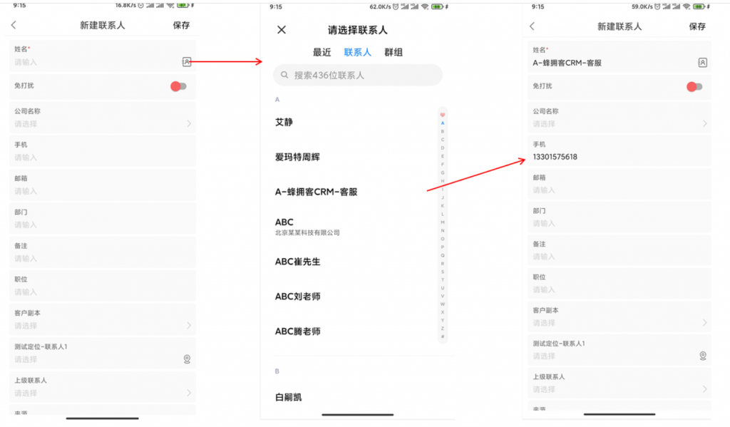 • 在手機端新建聯系人時可以在手機通訊錄里進行選擇,方便易用。