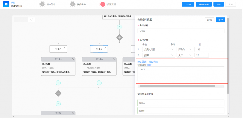 6)后臺配置的篩選條件中,員工和部門支持“不包括”條件,如審批流的分支條件