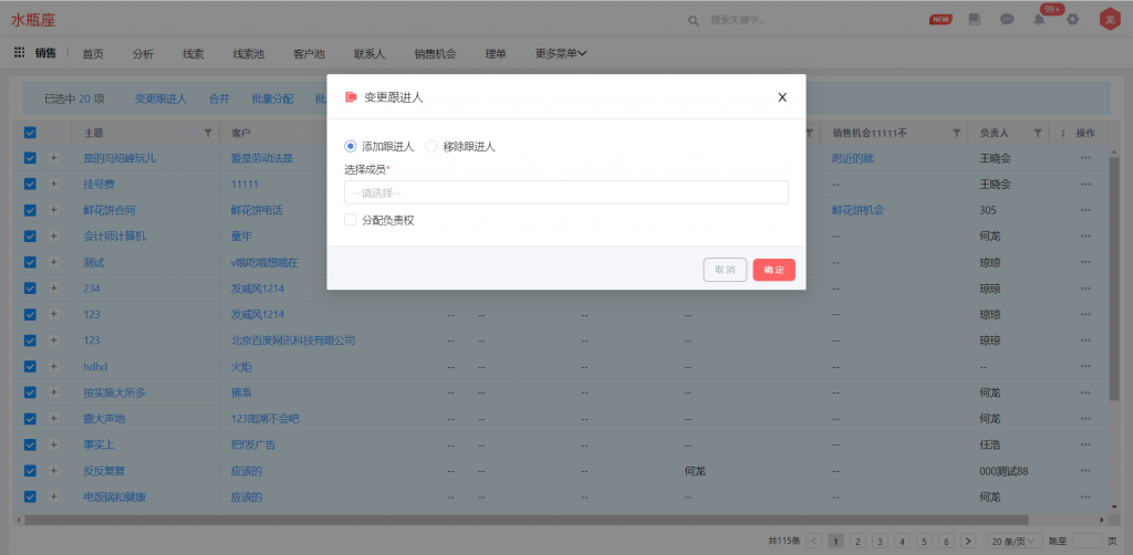 業務對象支持批量增加和刪除跟進人,同時增加“跟進人”字段,與跟進人組件同步,并支持篩選;使用前請先在對象管理中,將“跟進人”字段及“變更跟進人”按鈕的權限進行勾選