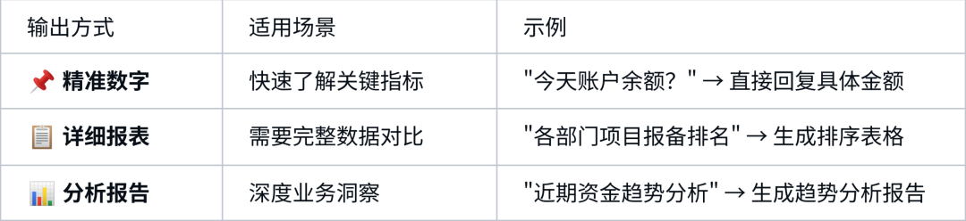 系統智能識別查詢需求,支持多種輸出方式,滿足不同場景需求: