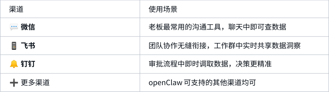 這意味著什么?意味著管理者無需打開復雜的系統界面,無需學習繁瑣的操作流程,只需通過微信、飛書、釘釘等日常溝通工具,像聊天一樣自然地提出問題,就能即時獲取關鍵經營數據。