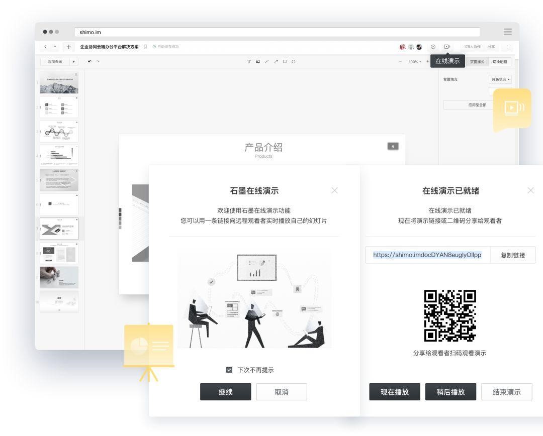 石墨還提供支持多人協(xié)作的幻燈片,團(tuán)隊成員可通過二維碼、鏈接分享給觀眾,無論身在何方,演示時觀眾只需打開電腦、手機(jī)、Pad 等設(shè)備就能實時同步播放,即使遠(yuǎn)隔萬里也如同在一個會議室面對面交流。