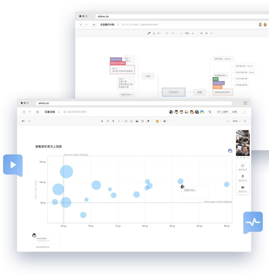 石墨白板讓遠(yuǎn)程會議更加高效便捷,多位成員通過音視頻連線,圍繞一個話題各抒己見,邊聊邊寫,邊聊邊畫,討論思路與結(jié)果同步呈現(xiàn)。