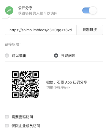 設(shè)置文檔公開分享時,可在石墨中設(shè)置“需要密碼訪問”或“僅限企業(yè)成員訪問”,從而實現(xiàn)文檔的定點(diǎn)定向傳輸,并可有效杜絕內(nèi)部文檔外泄。