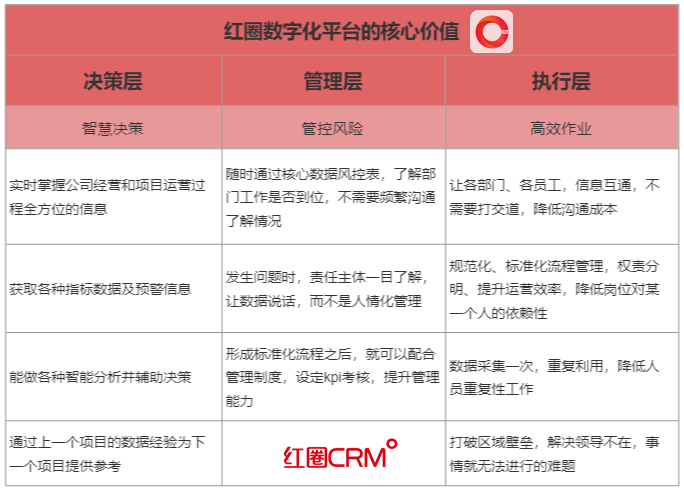 1、紅圈以助力企業營收為目的,首先站在決策者的角度,充分考慮老板的項目經營管理目標,制定符合目標的整體管理方案,然后圍繞執行部門的工作習慣做考量,搭建適合一線員工日常工作的操作流程,有效避免上層決策與基層操作的割裂問題。