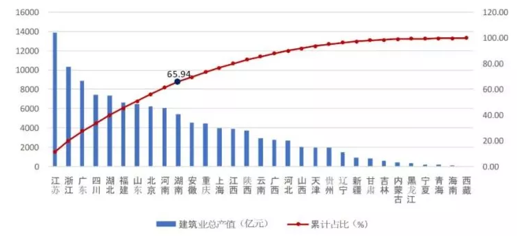 除江蘇、浙江外,總產(chǎn)值超過(guò)5000億元的還有廣東、四川、湖北、福建、山東、北京、河南、湖南8個(gè)地區(qū),上述10省市完成的建筑業(yè)總產(chǎn)值占全國(guó)建筑業(yè)總產(chǎn)值的65.94%(圖1)。