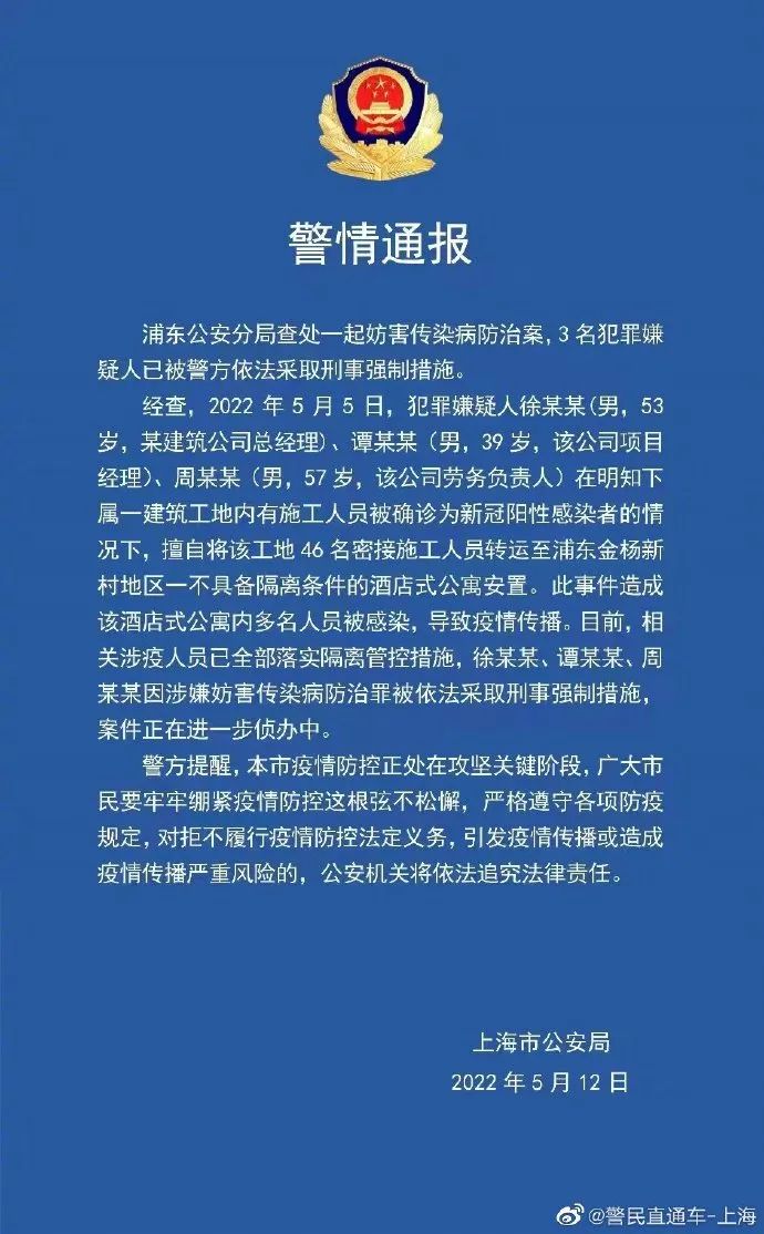 據(jù)上海市公安局通報經查,5月5日,犯罪嫌疑人徐某某(男,53歲,某建筑公司總經理)、譚某某(男,39歲,該公司項目經理)、周某某(男,57歲,該公司勞務負責人)在明知下屬一建筑工地內有施工人員被確診為新冠陽性感染者的情況下,擅自將該工地46名密接施工人員轉運至不具備隔離條件的酒店式公寓安置。造成該酒店式公寓內多名人員被感染,導致疫情傳播。