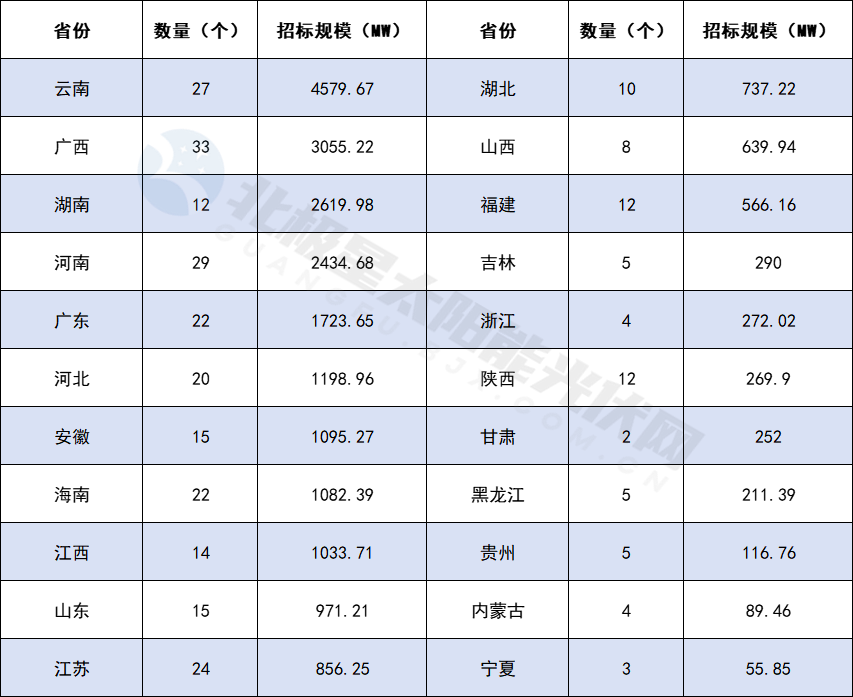 其中,云南以27個(gè)項(xiàng)目的總規(guī)模4579.67MW排名第一,而廣西則以33個(gè)項(xiàng)目的總規(guī)模3055.22MW緊隨其后。另外,湖南、河南、廣東、河北、安徽、海南、江西等省份的項(xiàng)目規(guī)模也達(dá)到了GW級(jí)別。