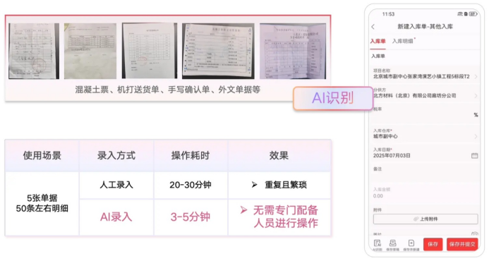 紅圈AI錄單助手就是來干這活的,靠大模型自動識別各種單據,從圖像識別到錄入系統,秒級閉環。甭管是混凝土票、機打送貨單,還是手寫的確認單,系統自動提取關鍵信息,匹配業務數據后回填。這一下就干掉90%的人工操作,也干掉了人工錄入可能帶來的所有錯漏。入庫材料自動跟合同明細掛上鉤,每一分錢的成本從哪來的,查得清清楚楚,后期想統計實際成本、追溯源頭,那是真方便。